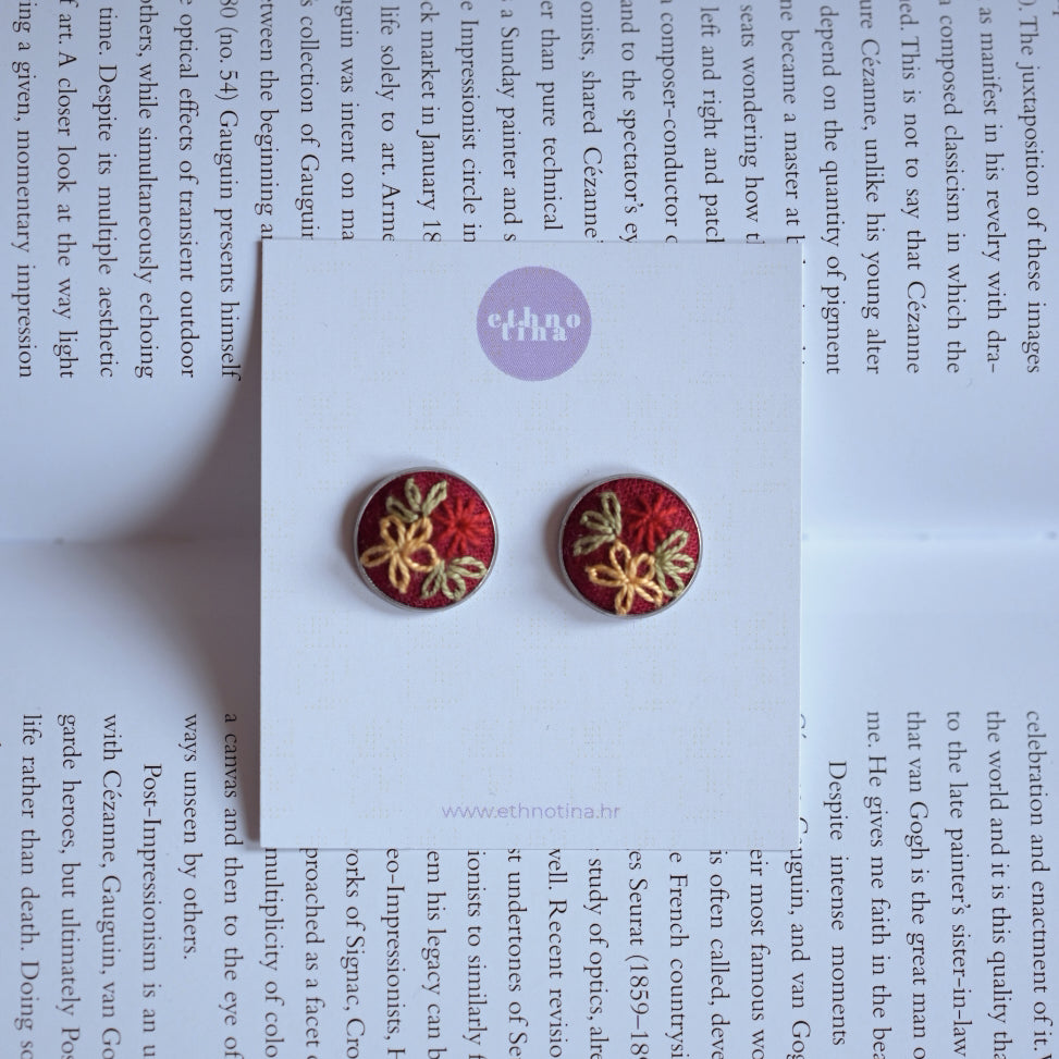 Ručno vezene naušnice izrađuju se od 100% lanenog platna te vezu pamučnim koncem. Svake naušnice su unikatne.