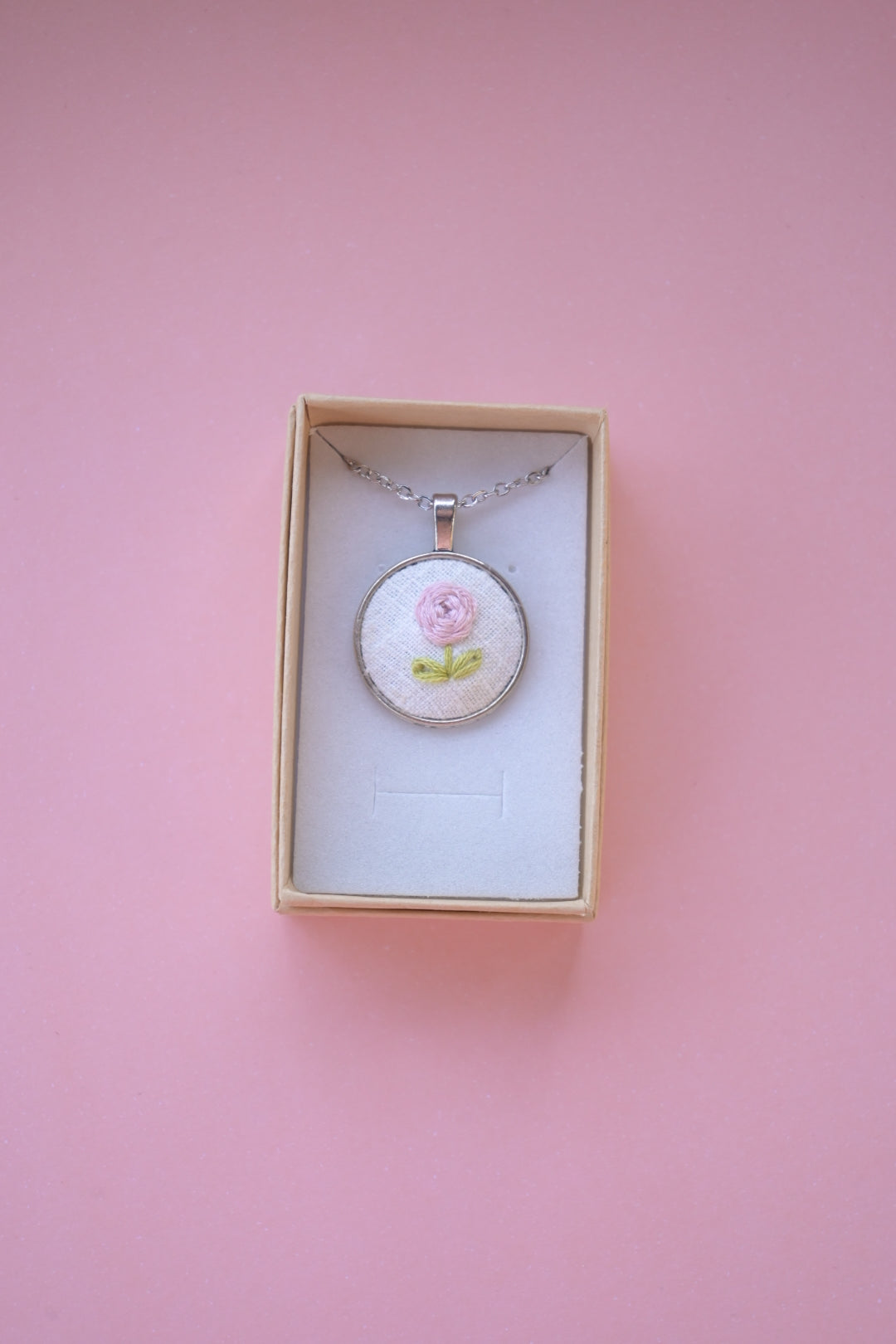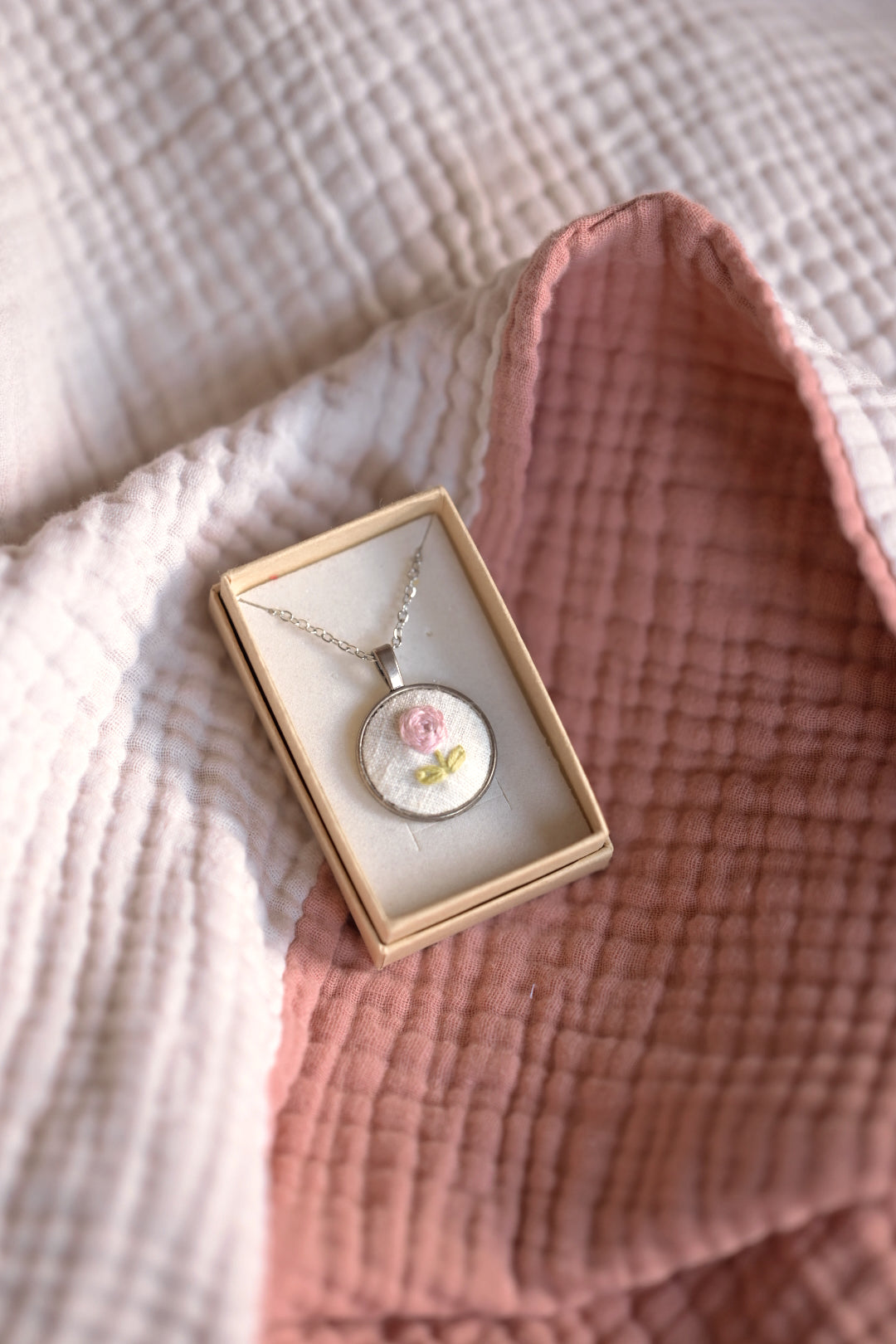 Ogrlica je napravljena od željeznog medaljona te se nalazi na 45cm dugoj ogrlici od čelika koja se kopča iza vrata. Pamučni vez izrađen je na lanenom platnu.