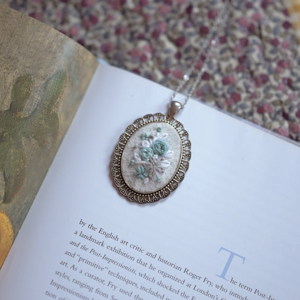 Ogrlica je napravljena od željeznog medaljona te se nalazi na 45cm dugoj ogrlici. Pamučni vez izrađen je na lanenom platnu.