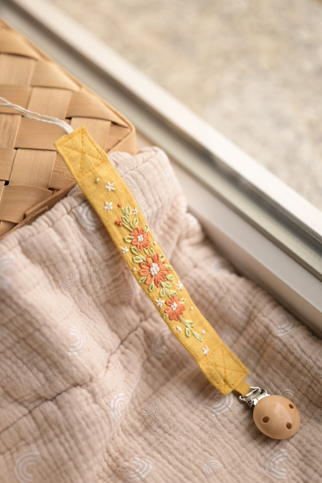 Vezica za dudu izrađena je od lanenog platna i vezena pamučnim koncem. Gornji dio kopče izrađen je je od drveta sigurnog za djecu, a donji dio od metala.
