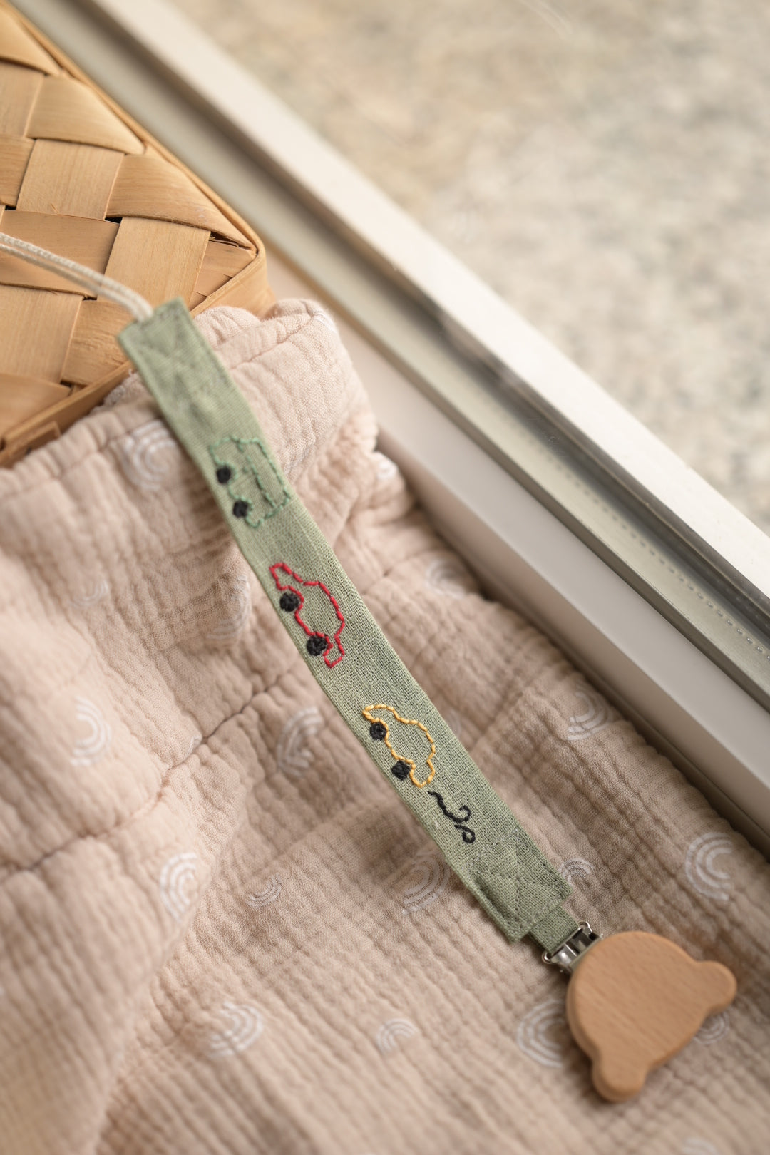 Vezica za dudu izrađena je od lanenog platna i vezena pamučnim koncem. Gornji dio kopče izrađen je je od drveta sigurnog za djecu, a donji dio od metala.
