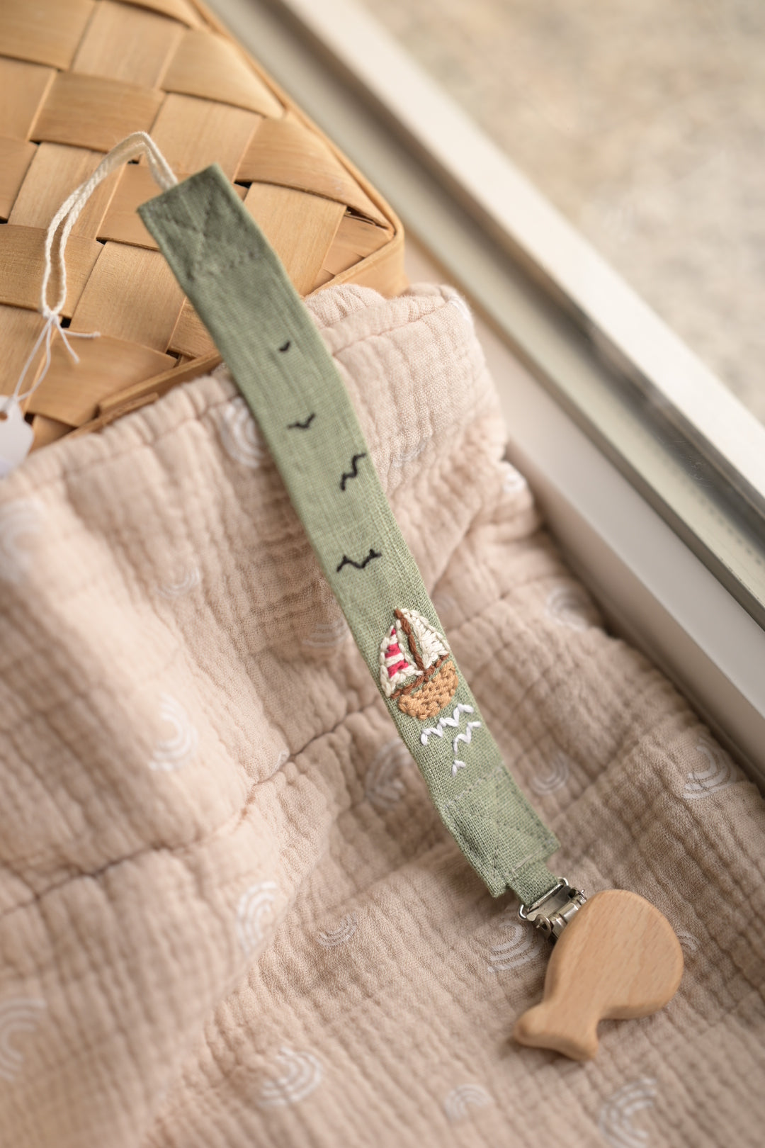 Vezica za dudu izrađena je od lanenog platna i vezena pamučnim koncem. Gornji dio kopče izrađen je je od drveta sigurnog za djecu, a donji dio od metala.