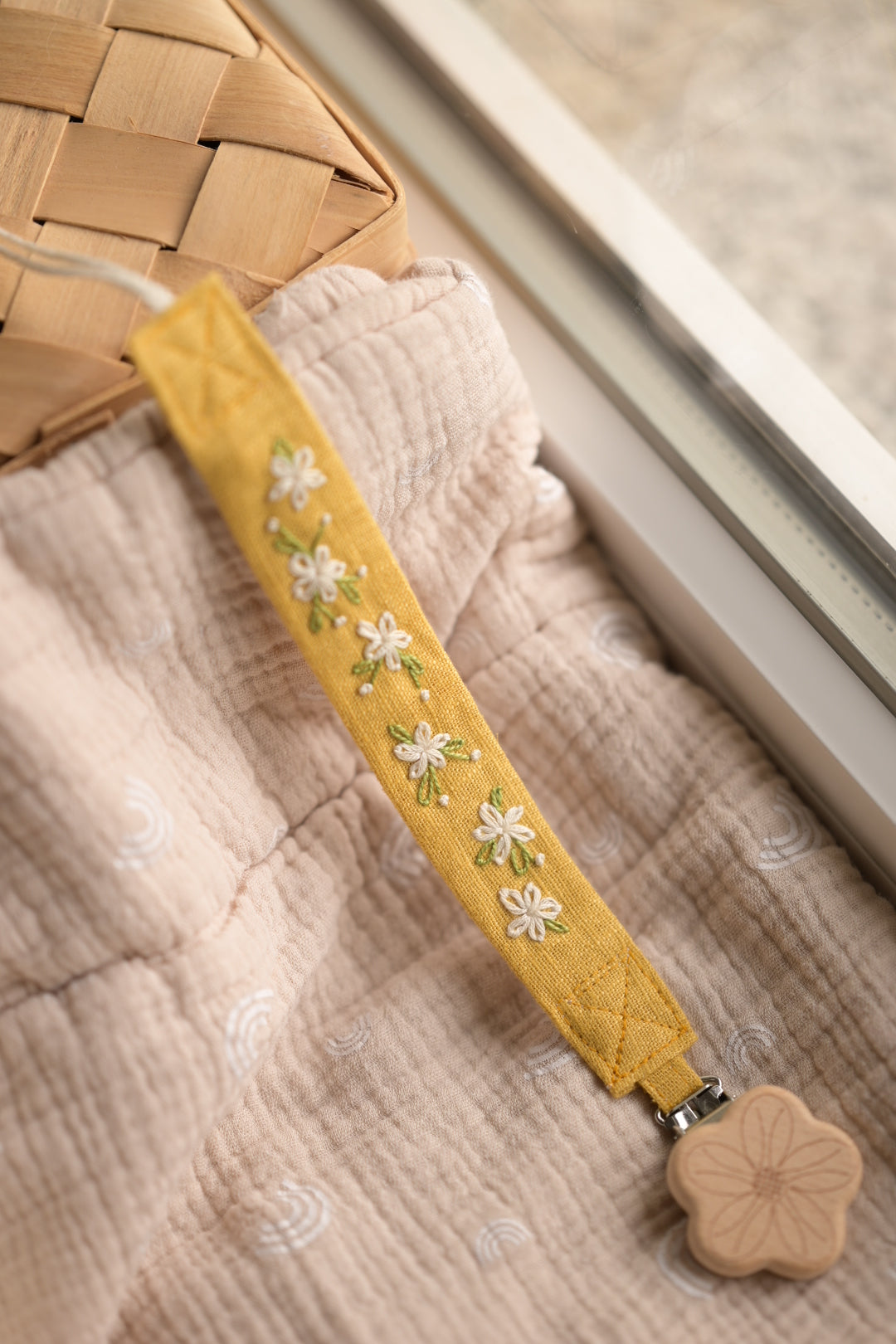 Vezica za dudu izrađena je od lanenog platna i vezena pamučnim koncem. Gornji dio kopče izrađen je je od drveta sigurnog za djecu, a donji dio od metala.